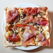 原材料:ピザ生地(自家製造)、チーズ(ナチュラル、パルメザン)、クリームソース、きのこ(マッシュルーム、ヌメリイグチ、ヤマドリダケ、ナメコ、ヒラタケ、シイタケ)、オリーブ油、生ハム(ハモンセラーノ)、黒こしょう(一部に小麦・乳成分を含む)